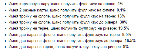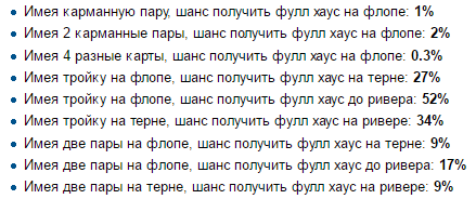 - Если ваш Фулл-Хаус сформирован из двух непарных карманных карт и обе они принимают участие в формировании комбинации, можно смело разыгрывать данную комбинацию, увеличивая банк. Дело в том, что такую комбинацию куда сложнее просчитать вашим соперникам, а вероятность наличия у них более сильного Фулл-Хауса слишком мала.
