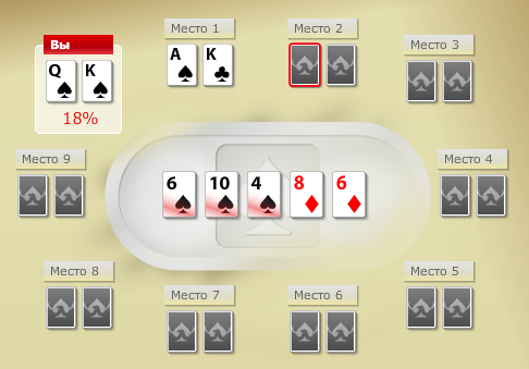 В сложившейся ситуации Флеш способен побить только Каре семерок или Стрит Флеш, в случае если у соперника в руках 6 и 7 бубен. Флеш Рояль из данных карт не собрать точно. Для Флеша достаточно держать две любой бубновой масти карты. И вот, собрав Флеш, играющий практически выигрывает.