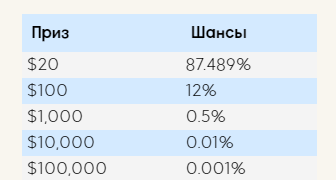 Для каждой бонусной суммы расписаны свои определенные шансы в процентном выражении: