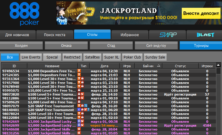 - Доступные для всех. Любой клиент покерной комнаты 888 Покер может участвовать в таких турнирах. Для этого просто нужно нажать на кнопку «Регистрация»;