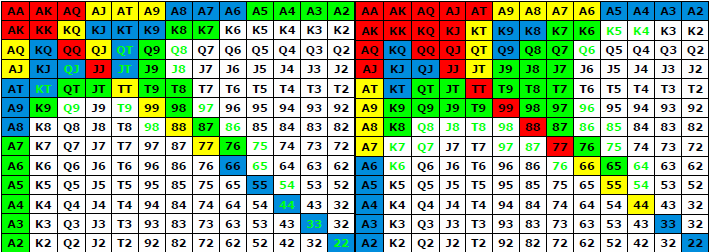 Для неопытных игроков были разработаны таблицы, отражающие комбинации, с которыми можно вступать в игру. Эта информация больше пригодится для новичков, бывалые же игроки вряд ли уделят ей должное внимание. Ведь покер это та игра, которую нельзя подогнать под определенные рамки и таблицы, профессиональные игроки действуют исходя из обстановки за игровым столом.