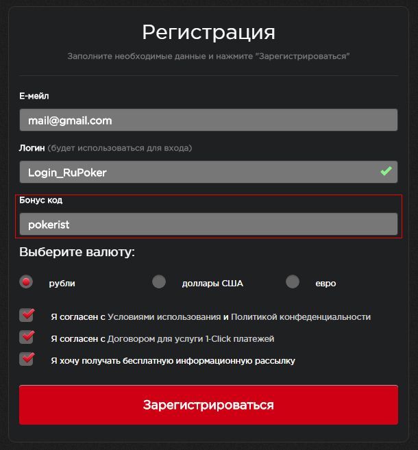 Думаем, что такая простая инструкция даст вам ответ на главный вопрос: как зарегистрироваться в РуПокер? На самом деле в этом нет ничего сложного. После заполнения всех регистрационных полей, необходимо еще раз проверить данные, которые вы ввели. Если все вписано правильно, то можно смело нажимать на кнопку «Регистрация». Также будет не лишним записать куда-то данные (логин и пароль).