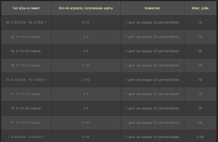 В этой покерной комнате, как и в любых других, есть своя система рейка (по сути, комиссия покер-рума за предоставление вам игровых услуг). В случае с Мобайл Покер Клаб, рейк разнится в зависимости от выбранного вами игрового стола, формата игры, лимитов за столов. Вы можете использовать удобную таблицу, чтобы разобраться с размером рейка, который с вас возьмут: