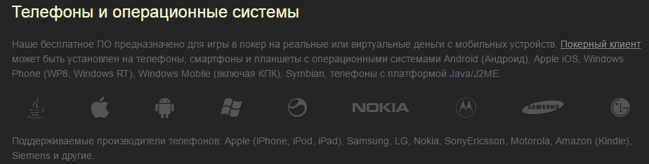 Главным преимуществом данного покерного клиента является то, что она работает на многих из тех устройств, которые сегодня уже мало кем используются, но при этом другие покерные комнаты даже не принимают их во внимание. К примеру, редко какой покер-рум может предложить приложение, которое будут работать на устройстве Киндл от Amazon. Вы можете посмотреть полный список устройств, на которых работает данный покерный клиент: