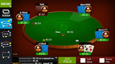 - Игровые столы с информационным чатом. В клиенте есть возможность играть в многостоловом режиме. Для удобства игры в таком режиме, есть боковая навигационная панель, которая дает возможность переключаться между столами. Также на данной панели показываются ваши карты за каждым из игровых столов;