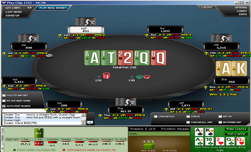 Holdem Indicator делает расчёт пот оддсы, изучает размер банка, позицию соперников. Оддсы на руках также возможно высчитывать, скачав бесплатно Холдем Индикатор. Оддсы на руках показывают комбинацию, собравшуюся у игрока на ривере. Программа помогает рассчитывать оддсы на руках как для самого участника игры в покер, так для остальных пользователей за столом.
