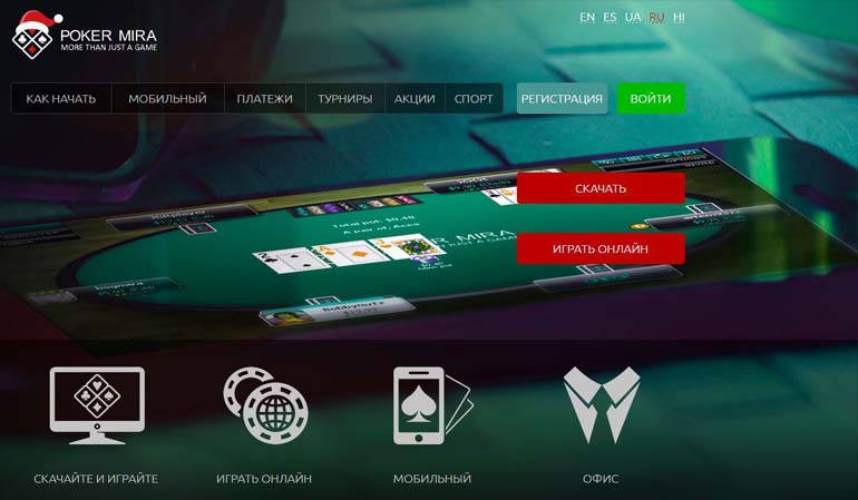 Сайт покерной комнаты Покер Мира предлагает своим клиентам весь необходимый функционал. В частности, у клиентов есть возможность авторизоваться в покер-руме прямо на странице официального сайта. Здесь есть возможность пополнить свой игровой счет. Кроме того, вы можете как использовать браузерную версию приложения, так и скачать с poker mira.com покерный клиент для установки на ПК или мобильное устройство.