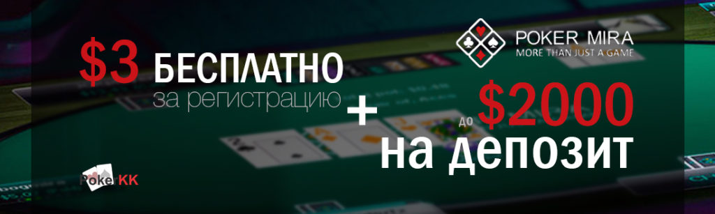 Те игроки, которые прошли процедуру регистрации в покерной комнате и впервые пополнили свой счет, автоматически получают приветственный бонус от покер-рума Pokermira. Размер бонуса составляет 100% от размера стартового депозита, но не может быть больше 2 тысяч долларов.