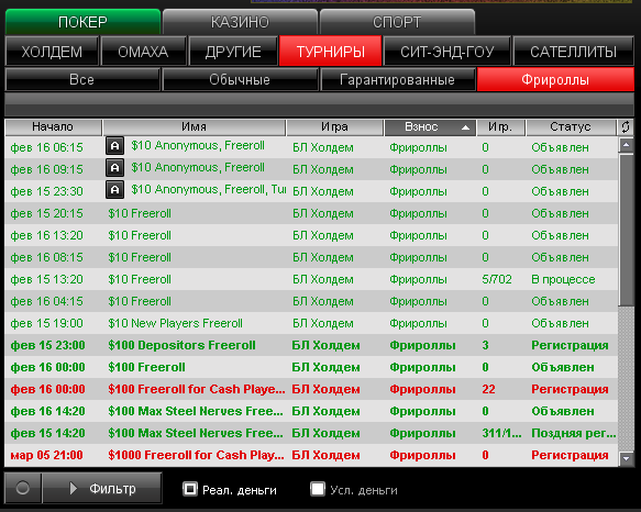 Premium $500 Freeroll. Так называются бесплатные турниры, для тех клиентов, кто успел получить в покерной комнате VIP-статусы «Бронза», «Серебро» либо выше. Такие турниры проводятся два раза в месяц.