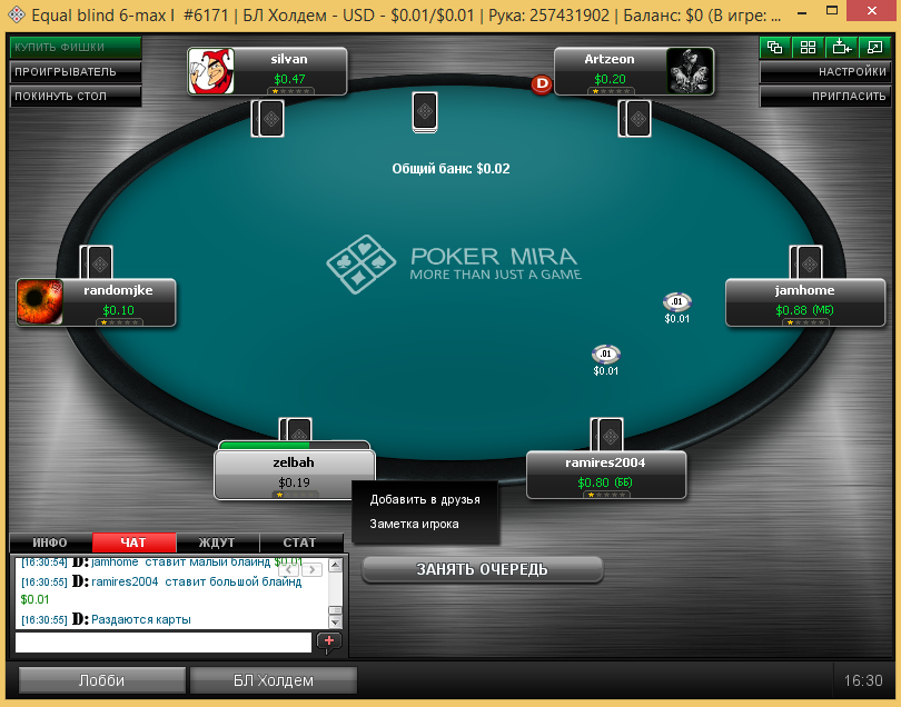 Скачать и играть на Pokermira вы можете в любое удобное для вас время. Однако здесь нас и поджидает главная проблема этой покерной комнаты. Дело в том, что здесь далеко не самый большой трафик игроков. Соответственно, иногда бывает проблематично найти соперников для некоторых дисциплин. Все это усугубляется тем, на постоянной основе здесь играют только за столами с низкими, а также микро-лимитами.