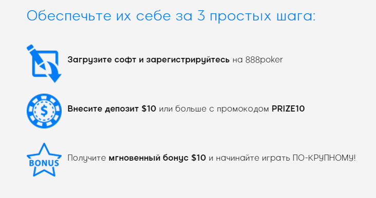 Если у вас есть желание получить обычный отыгрываемый бонус на сумму до 400 долларов, то нет необходимости указывать промокод для 888poker.com. Ну, а если вам был выбран мгновенный бонус, то нужно будет в официальный сайт 888Poker вписать промокод – PRIZE10. Вот правила, по которым на ваш игровой счет будет начислен мгновенный бонус: