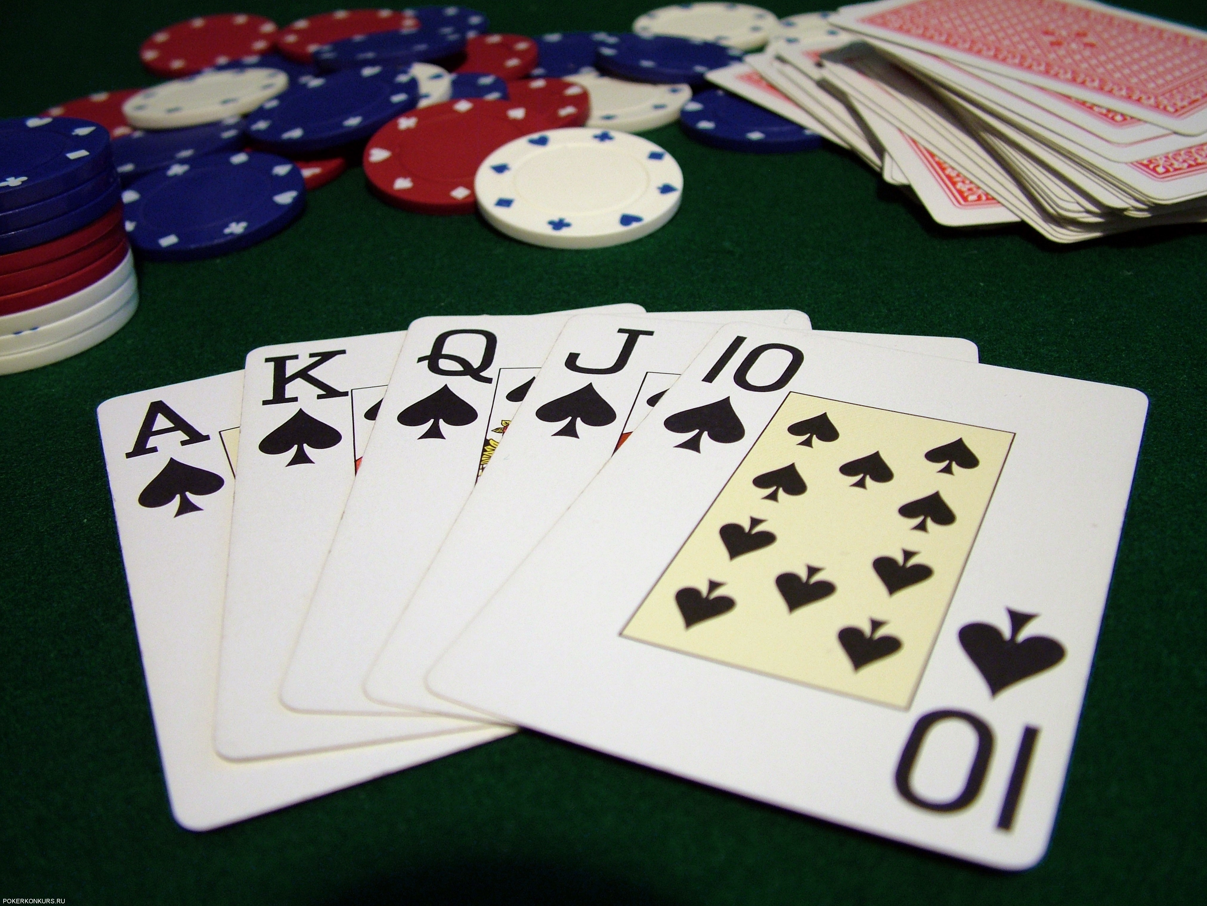 По сути, для покера ривер относится к очень сильному кругу из всего турнира, поэтому желательно здесь ошибок уже больших не совершать. Давайте продумаем такую ситуацию: на руки вам выпали пиковые король и десять и вы надеетесь собрать флэш. На покерный стол выпали четыре червовых карты, хоть туза нам нет.