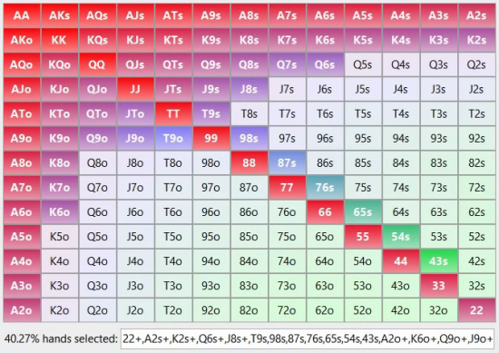 По показателю VPIP можно наверняка рассуждать о том, с каким типом игрока вы столкнулись. Участники игры, значение VPIP которых выше 40%, обычно на деле фиши, что означает, что перед вами не самые сильные оппоненты. Такие предпочитают входить в банк с картами так себе или более менее. Лишь чтобы увидеть флоп, что, несомненно большая ошибка. В приведенной ниже таблице можно посмотреть диапазон рук при старте участников с показателем VPIP равным 40%.