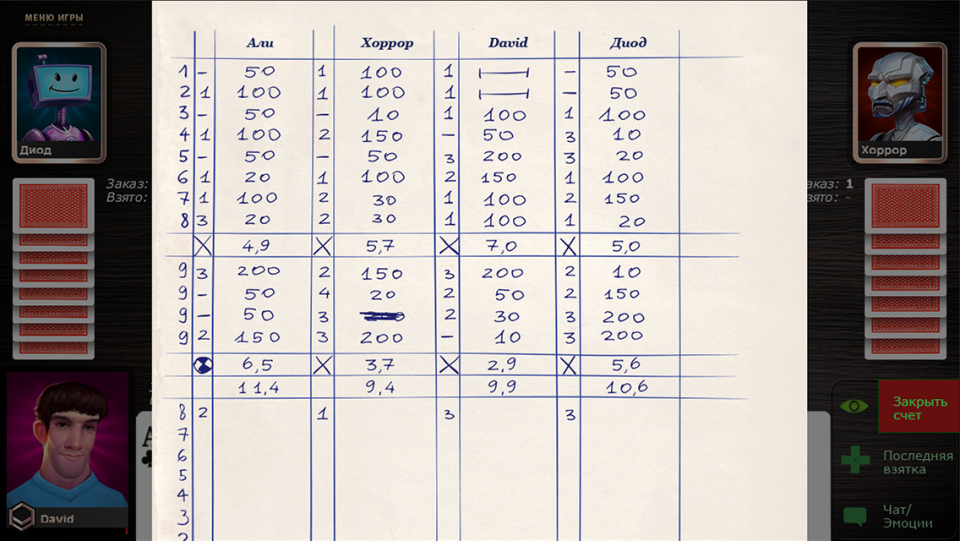 Внимательным нужно быть сдающему участнику, так как к тому моменту, когда до него дойдет очередь все игроки уже скажут свое слово. Рассмотрим простой пример. Каждый из участников имеет на руках по пять карт, при этом они уже заказали 4 взятки. Сдающий игрок в таком случае уже не может брать 1 взятку. Он вправе либо взять 2 взятки, либо же отказаться, сказав пас.
